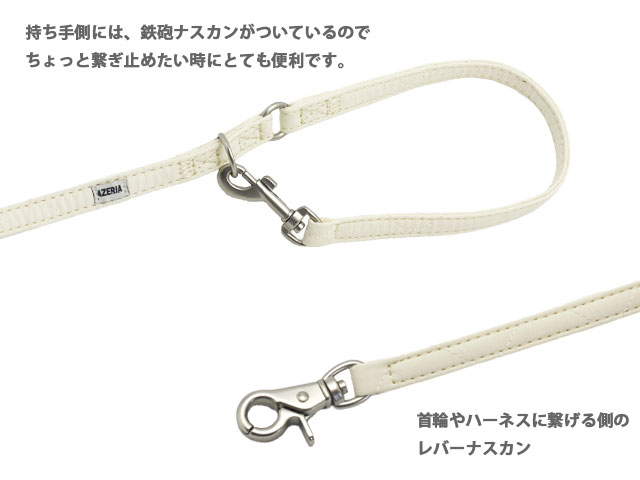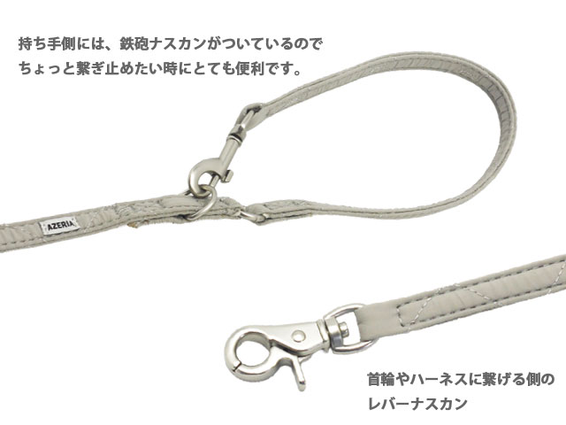 - リードの持ち手側は、鉄砲ナスカンがついているので、ちょっと繋ぎ留めたいときに便利です。